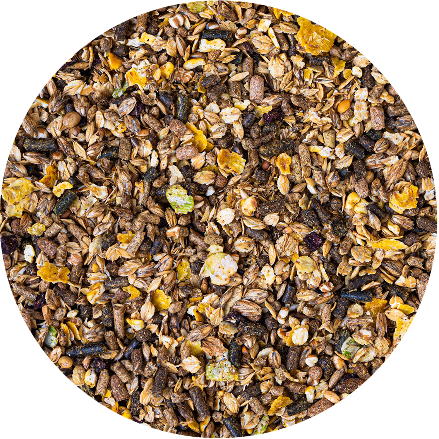 Havreskaldelar, korn, lusern, vetekli, rapskaka, sojabönor (NON-GMO), majsmjöl, majs, ärtor, extruderat linfrö, puffat korn, rapsolja, åkerbönskaldelar, betfiber, rödbetsflingor, dumosweet, cikoria.
